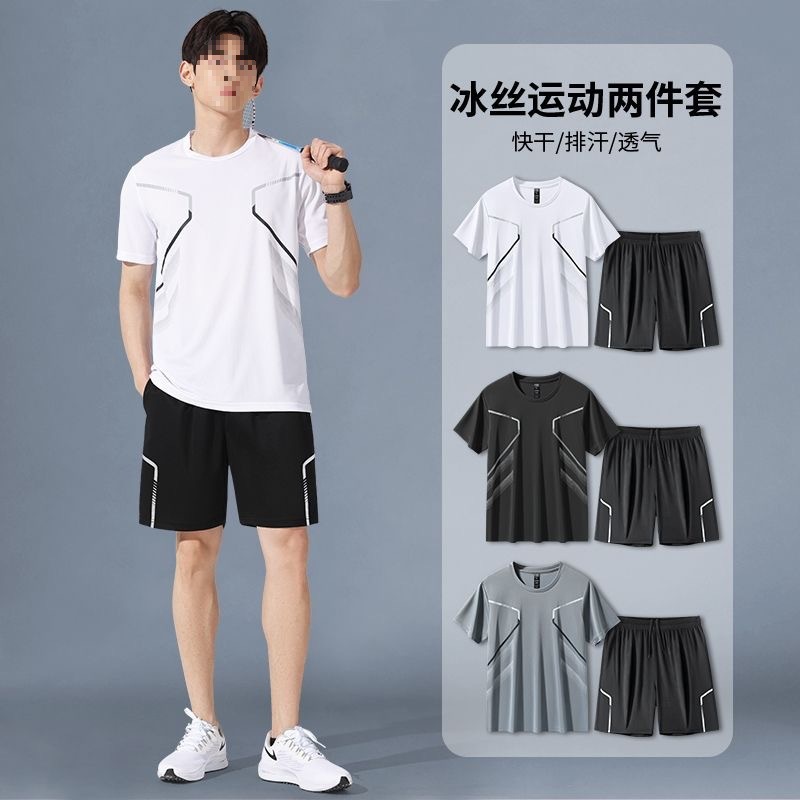 ملابس اللياقة البدنية للرجال من الحرير الجليدي بأكمام قصيرة تي شيرت سريع الجفاف ملابس رياضية صيفية بدلة كرة السلة شورت عداء الصباح لغرفة التدريب