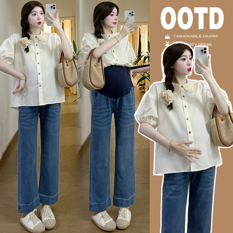 أزياء خارج النساء الحوامل الصيف قميص فضفاض دمية قميص بدلة على الموضة 2024 جديد الجينز قطعتين مجموعة
