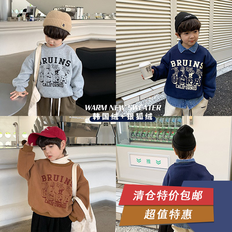 [تصفية خاصة] سترة أطفال مخملية كلاسيكية مزدوجة الطبقات مطبوعة على الطراز الكوري برقبة دائرية دافئة للأولاد والبنات