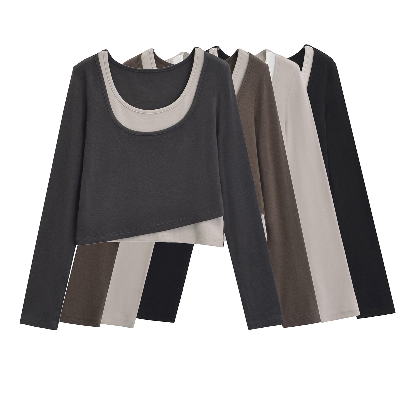 E3FEI-1687 تي شيرت مزيف مكون من قطعتين ملابس نسائية على الطراز الكوري للبيع بالجملة 2024 أوائل ربيع جديد خياطة تنحيف ألوان متباينة كم طويل