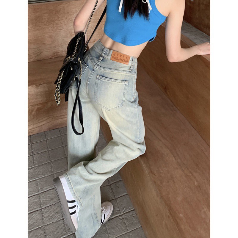 جينز رفيع على الطراز الأمريكي للنساء لصيف 2024 بخصر عالٍ فضفاض ومظهر نحيف طويل القامة يناسب الجميع سراويل طويلة بأرجل واسعة