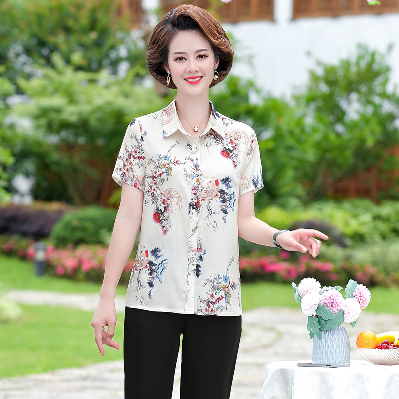 الأم الصيف أنيقة التلبيب قصيرة الأكمام الأزهار قميص النمط الغربي تي شيرت منتصف العمر وكبار السن المرأة تقليد الحرير قميص مطبوع