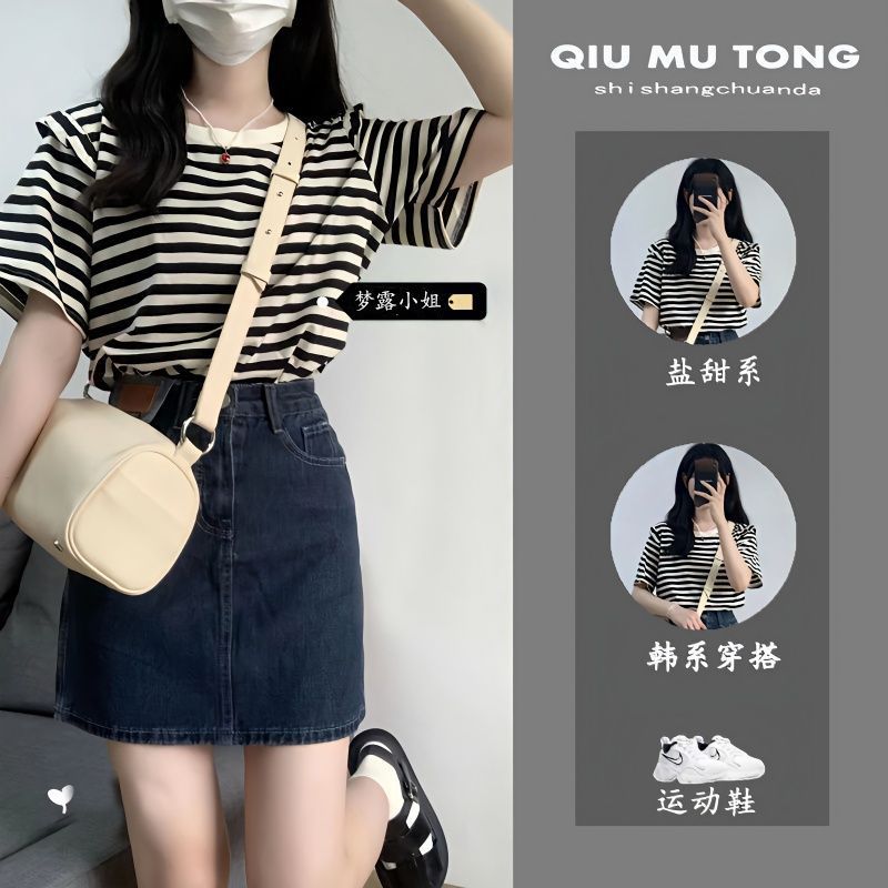 بدلة من قطعتين/قميص صيفي مخطط بأكمام قصيرة من قطعة واحدة للنساء على الطراز الكوري ملابس لطيفة قميص الطالب آخر/بوليستر