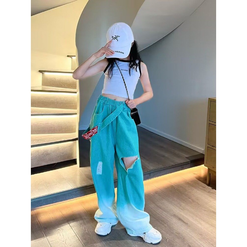 جينز صيفي متدرج للفتيات 2024 نمط جديد صيفي النمط الغربي للأطفال إنترنت المشاهير الشارع ممزق واسع الساق عصري