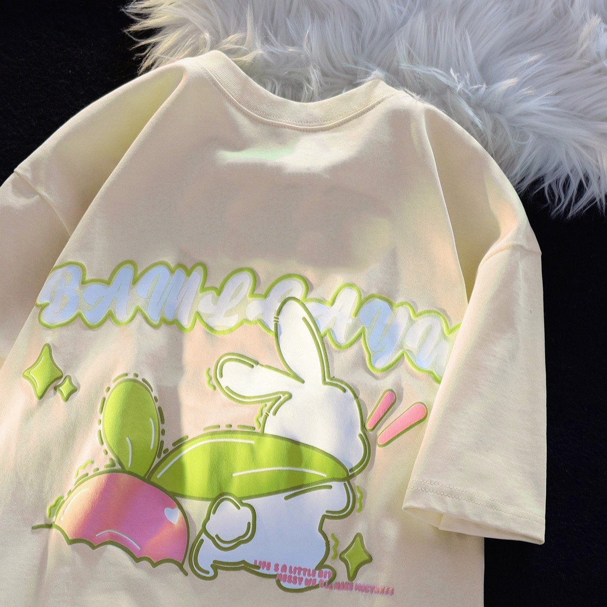 القطن الخالص 2024 الصيف أرنب طالب حبر أبيض تي شيرت المرأة قوية متعة تناسب فضفاضة الكتف قصيرة الأكمام تي شيرت المرأة