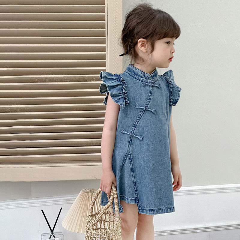 فستان بناتي بأكمام طائرة 2024 فستان صيفي جديد للأطفال فستان شيونغسام صيني مشهور على الإنترنت فستان دينم أنيق للفتيات الصغيرات
