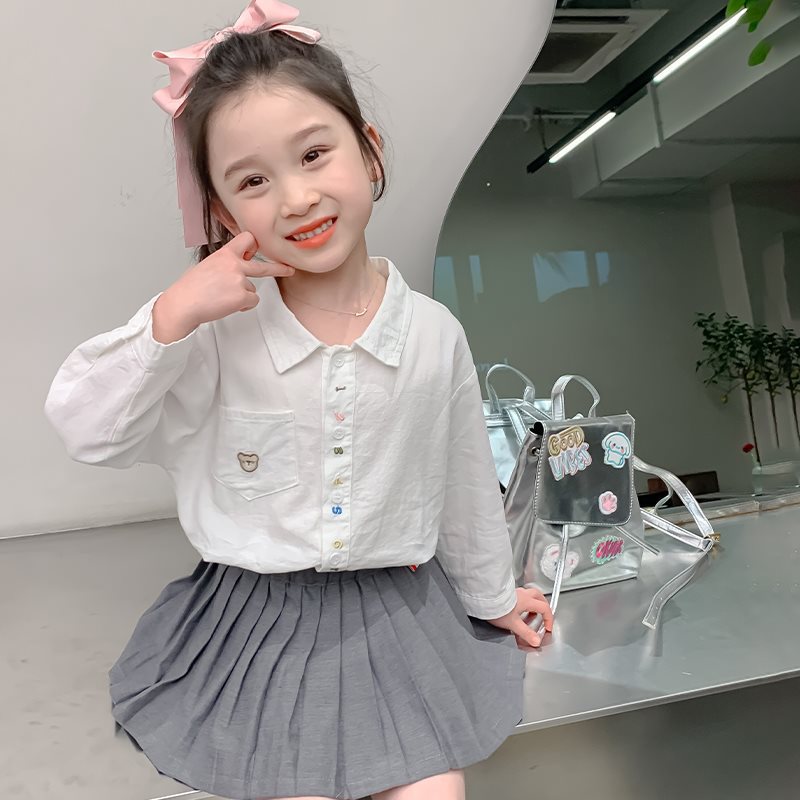 قميص الفتيات لربيع وخريف 2024 قميص أطفال جديد على الطراز الغربي للربيع أبيض بأكمام طويلة