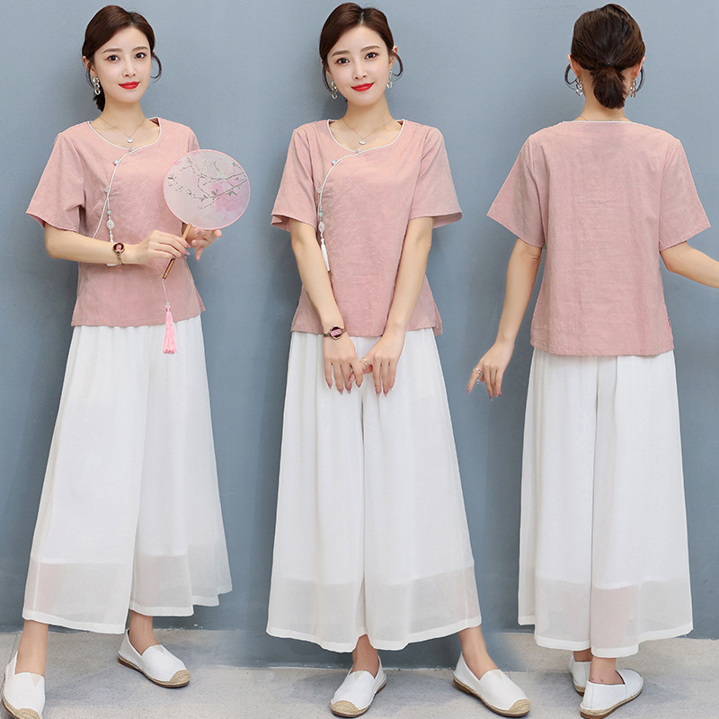 جيل من ملابس اليوجا الصيفية الجديدة المصنوعة من القطن والكتان على الطراز الصيني ملابس شاي زن سترة ملابس زن + بنطال شيفون واسع الساق