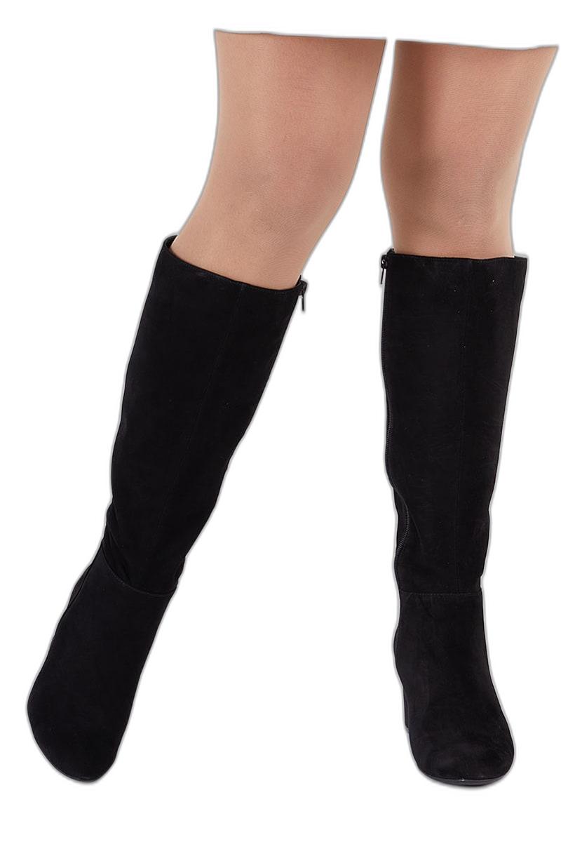 حذاء أسود من جلد الغزال يصل إلى الركبة للنساء ذوات العجول الواسعة.