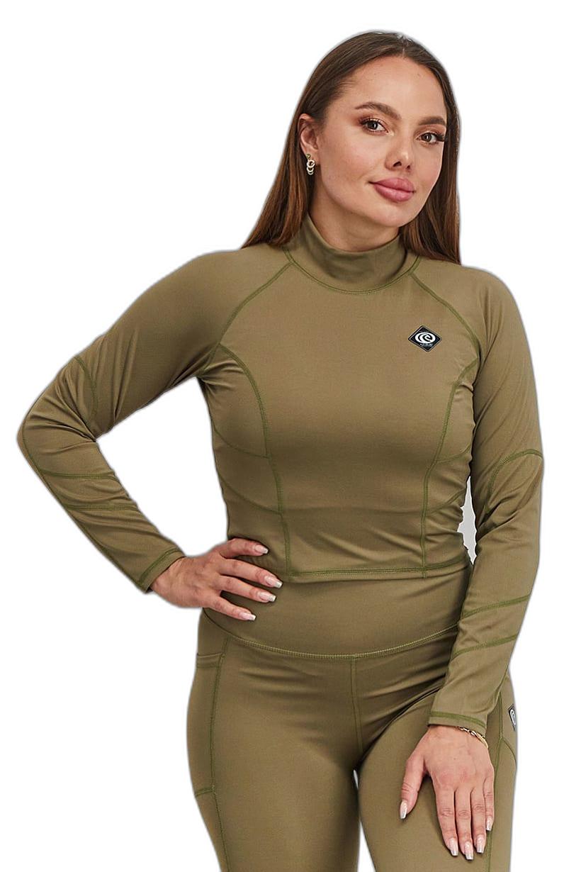 بلوزة رياضية بأكمام طويلة ورقبة دائرية باللون الزيتوني للملابس الرياضية النسائية.