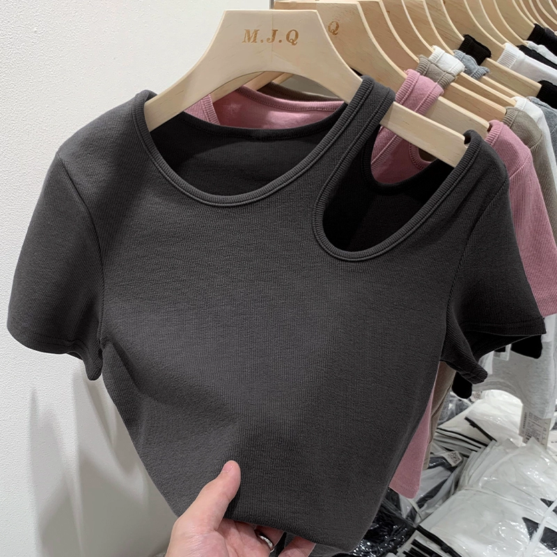 تي شيرت بقصة ضيقة مكشوف على شكل عظمة الترقوة، بلوفر صيفي جديد