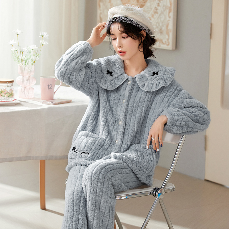 بيجامة مخملية مرجانية للسيدات للربيع والخريف والشتاء سميكة بالإضافة إلى بدلة منزلية بأكمام طويلة مخملية لطيفة على طراز الأميرة فلانج