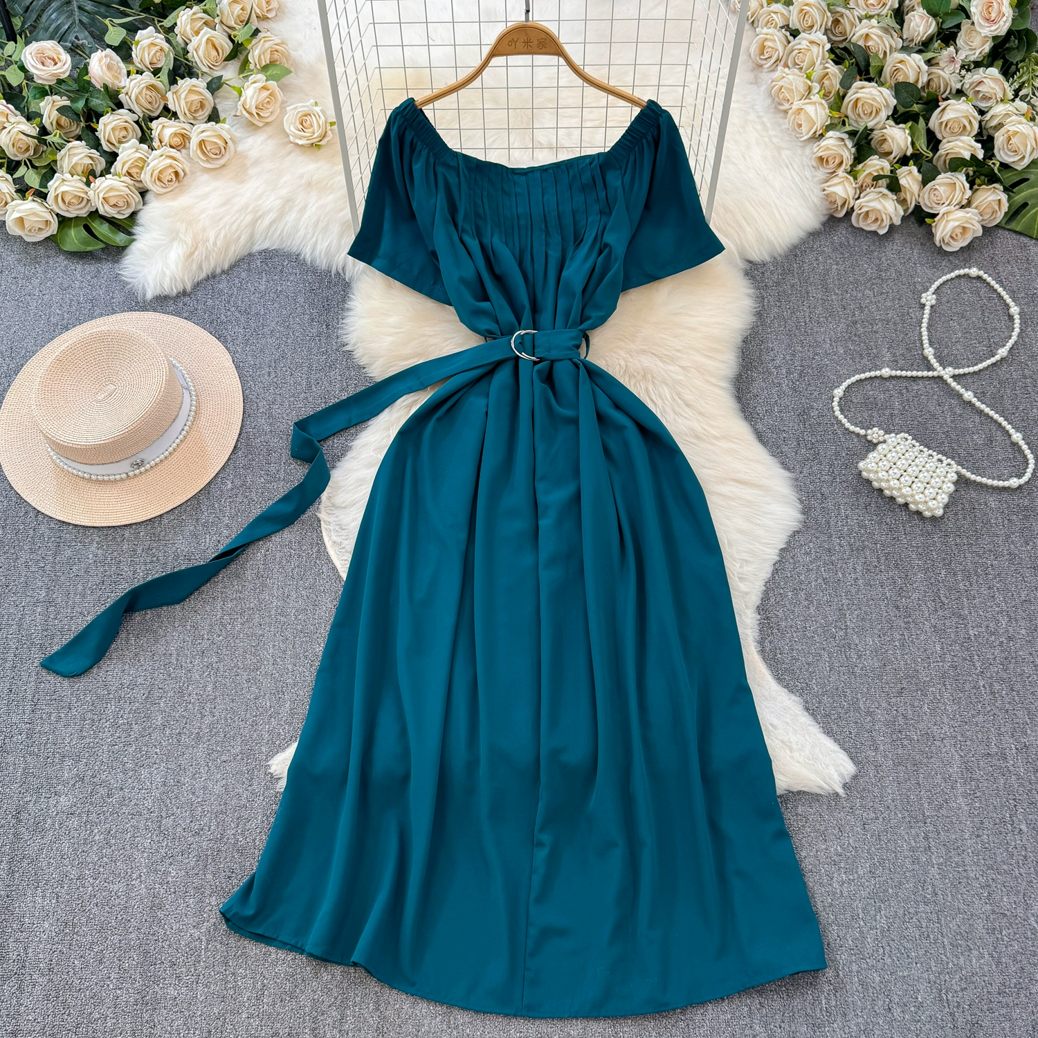 ضوء وناضج نمط الرجعية مزاجه فقاعة قصيرة الأكمام العنق مربع الخصر التخسيس ألف خط اللباس فستان طويل أنيق