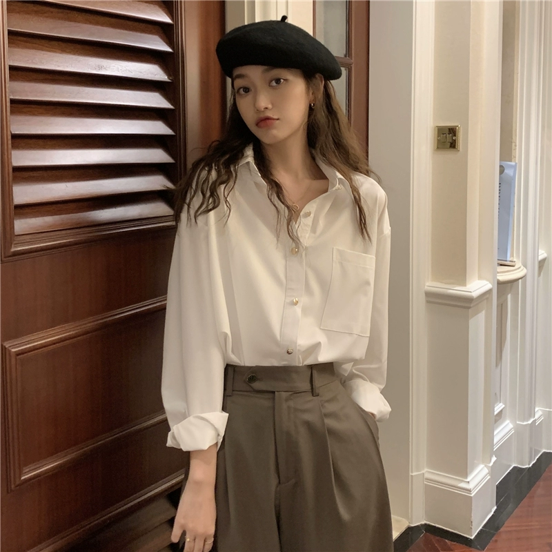 قميص بولو سبرينغ هونج كونج فضفاض بأكمام طويلة أبيض غير رسمي