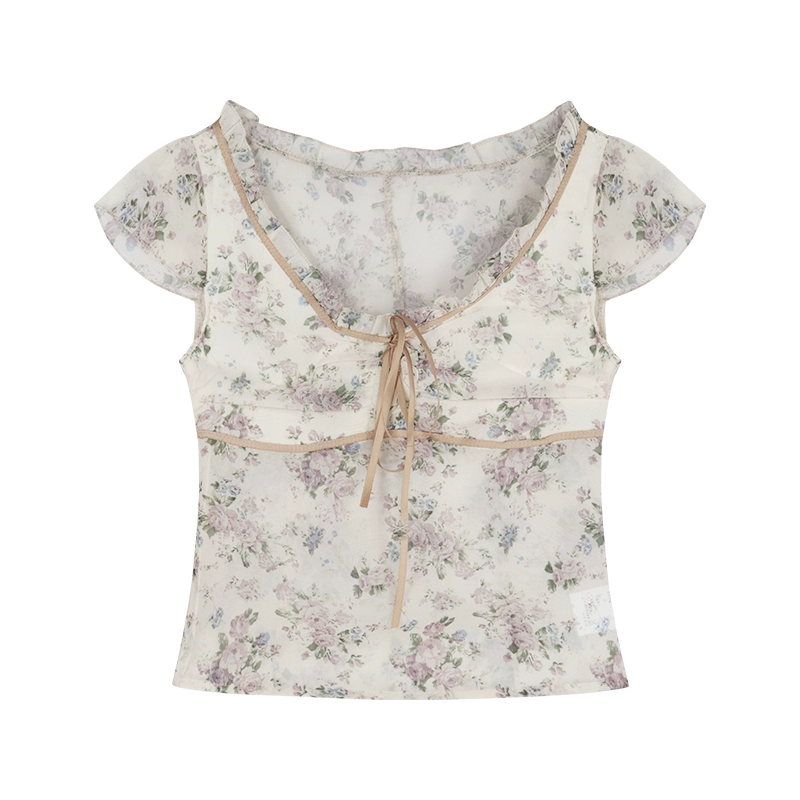 تي شيرت نسائي كوري مطبوع لتغطية البطن بأكمام قصيرة