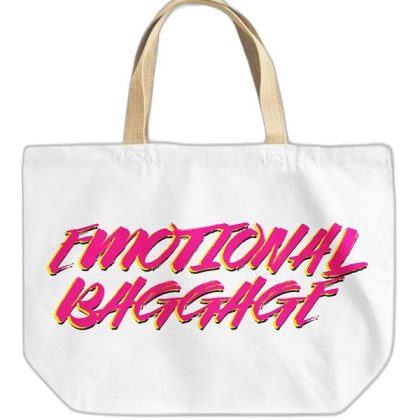 حقيبة شاطئ باللونين الأبيض والبيج لحمل الأمتعة العاطفية بلمسة مرحة. |