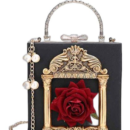 حقيبة يد أنيقة مربعة مزخرفة بالزهور مع قفل بمشبك باللون الأسود أو الذهبي أو الأحمر. |