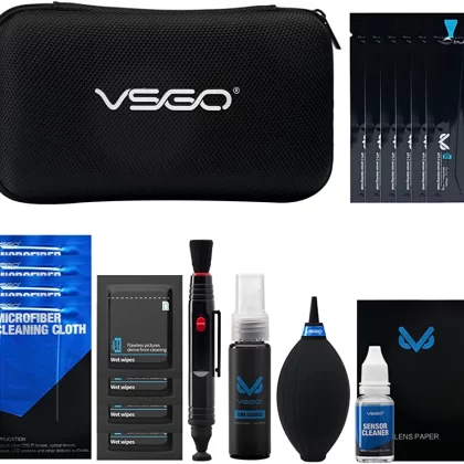 مجموعة تنظيف العدسات الاحترافية مع منفاخ هواء وقماش من الألياف الدقيقة ومناديل مبللة وفرشاة معدنية ومسحة قطنية وحقيبة قابلة للطي لتنظيف عدسة الكاميرا والهاتف والكمبيوتر المحمول. |