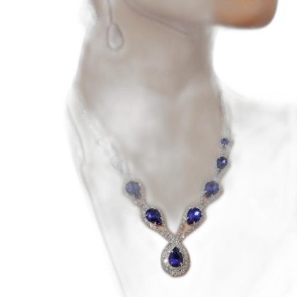 طقم قلادة وأقراط من حجر الراين مع قلادة على شكل قطرة وسلسلة على شكل حرف V. مثالية لإكسسوارات فساتين الزفاف والسهرة. |