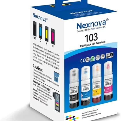 مجموعة نيكسنوفا® Ink 103 المجمعة المكونة من 4 قطع لطابعات EPSON EcoTank باللون الأسود والأزرق والأرجواني والأصفر. متوافق مع الطرازات L1110 وL3110 وL3111 وL3150 وL3151 وL3156 وL3160 وL5190. |