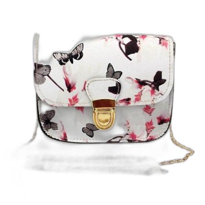 حقيبة كروس بودي باللونين الأبيض والوردي مع طباعة الفراشة والزهور. |
