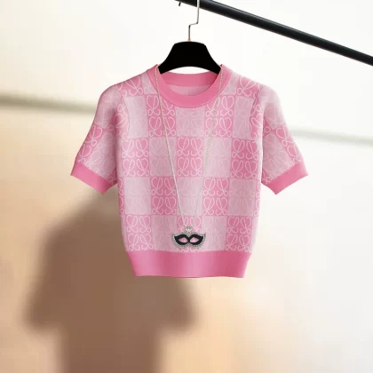 كنزة صوفية برقبة دائرية وخصر عالٍ وأكمام قصيرة |