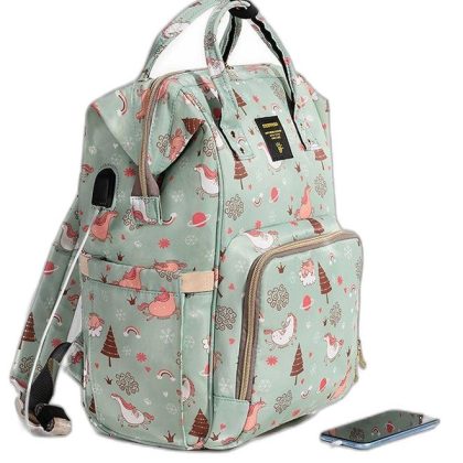 حقيبة ظهر للحفاضات مبطنة باللون الأخضر مع حقيبة لهّاية وخطافات لعربة الأطفال. |
