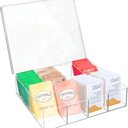 منظم أكياس الشاي القابل للتكديس مع غطاء - يحمل أكياس المشروبات والأغطية والعبوات - مثالي لخزائن المطبخ وأسطح الطاولات والمخزن. |