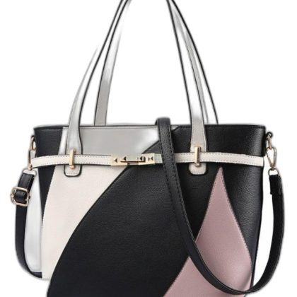 حقيبة كتف مريحة بتصميم كتل الألوان باللون الأبيض والأسود والبيج. |