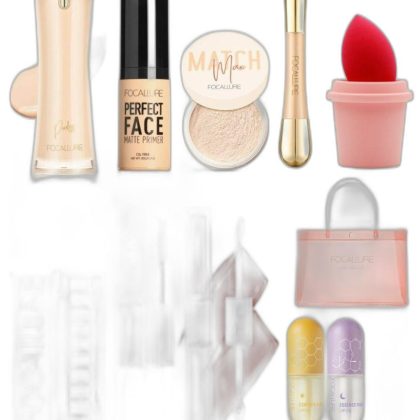 مجموعة المكياج تشمل كريم الأساس السائل والبرايمر ومسحوق التثبيت وفرشاة الكونسيلر ولوحة ظلال العيون والماسكارا والكحل وزيت الشفاه وأحمر الشفاه وملمع الشفاه والإسفنج وحقيبة التسوق. |