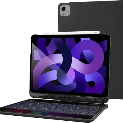 غطاء لوحة مفاتيح أسود لآيباد أير الجيل الخامس وآير الجيل الرابع وآيباد برو 11 بوصة مع 7 ألوان بإضاءة خلفية وغطاء واقي يدور بزاوية 360 درجة وخاصية النوم/الاستيقاظ التلقائي. |