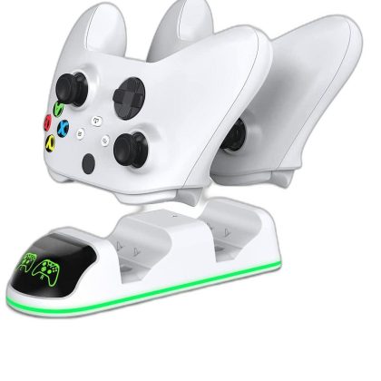قاعدة شحن بيضاء لأجهزة إكس بوكس مع بطاريتين قابلتين لإعادة الشحن. |
