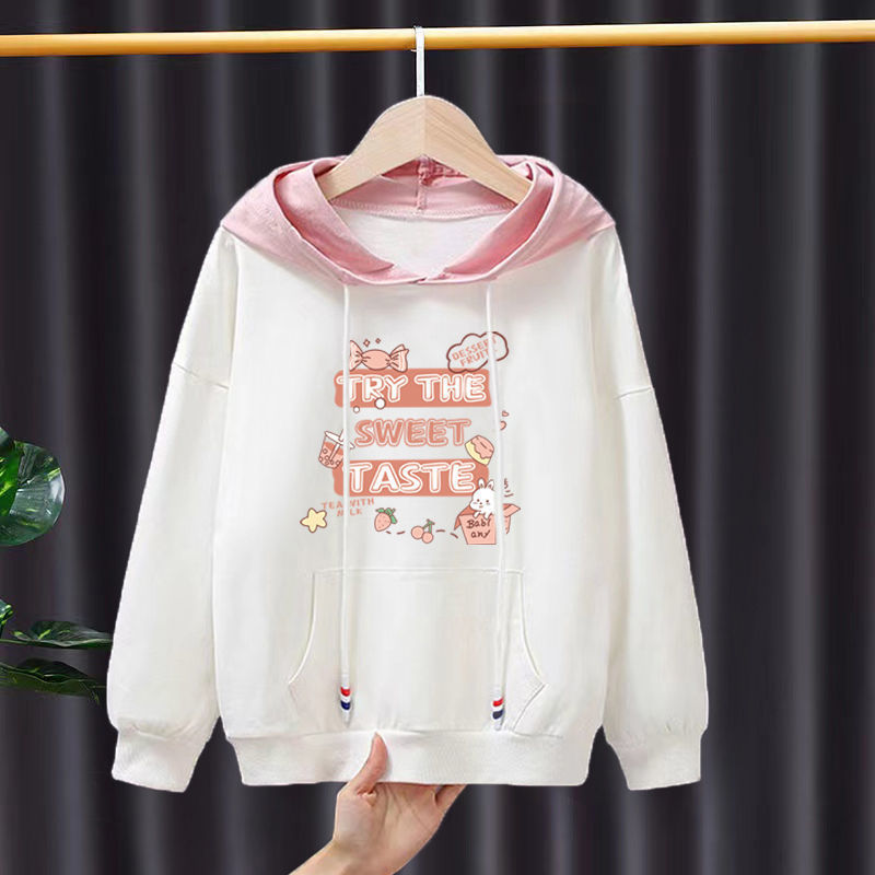 سويت شيرت بقلنسوة للفتيات لربيع وخريف 2023 جديد على الطراز الكوري للأطفال لخريف فضفاض ومطبوع ورفيع