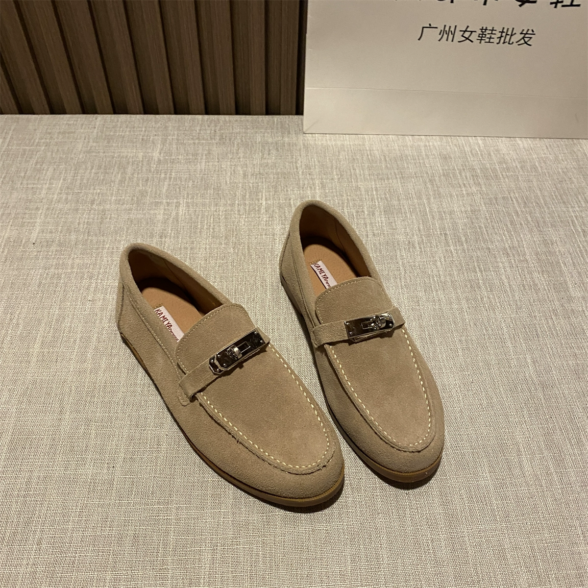 حذاء نسائي أوروبي بكعب منخفض ومقدمة مستديرة من جلد نوبوك بإبزيم معدني