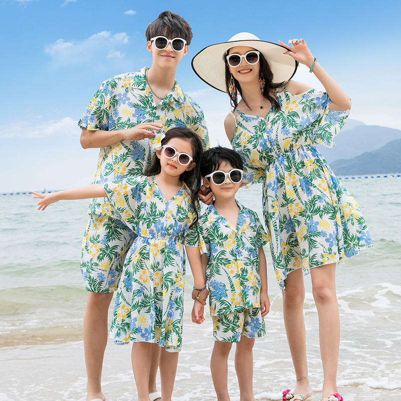 ملابس الوالدين والطفل 2023 ملابس صيفية جديدة لعائلة مكونة من ثلاثة أو أربعة جميع ديكورات المنزل على الطراز الغربي فستان الأم والابنة على شاطئ سانيا
