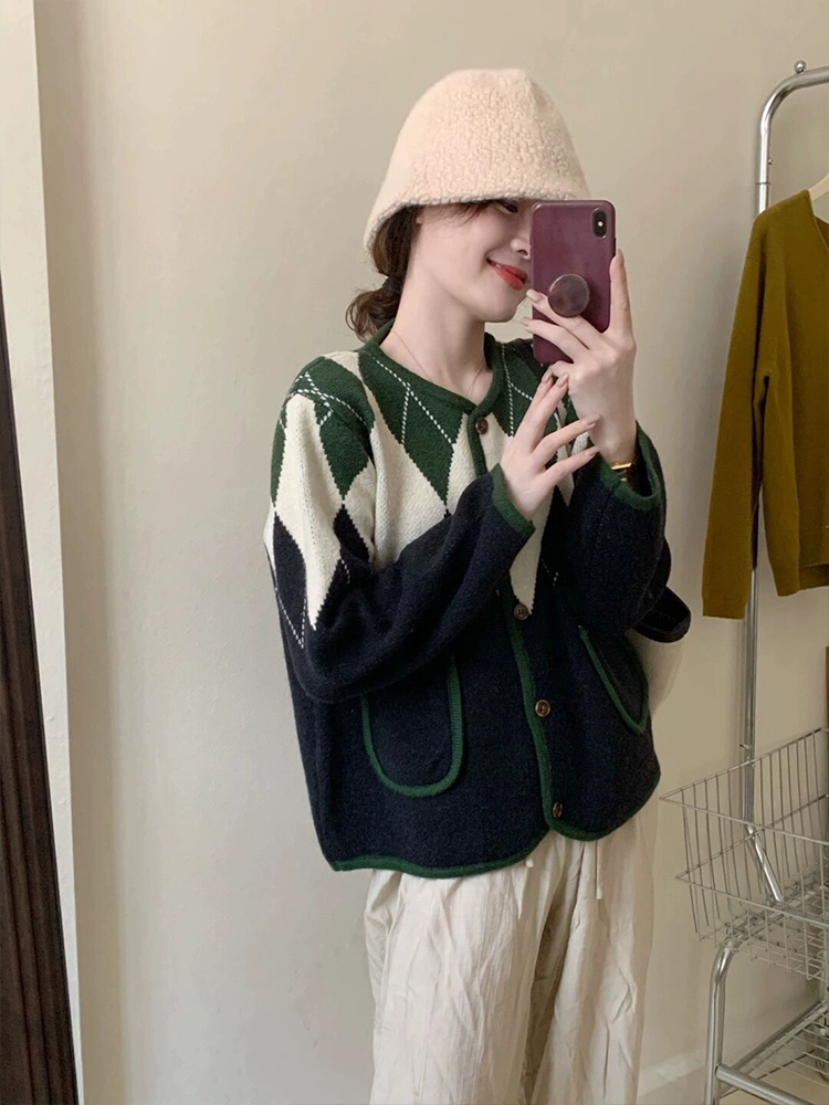 سترة سترة محبوكة على شكل معين ياباني كسول