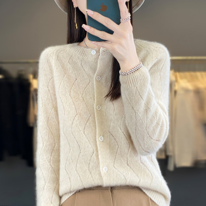 الربيع والخريف جديد سترة صوفية نقية الجولة الرقبة موضة المرأة سترة مشغولة من الصوف فضفاضة علوية أنيقة بالجملة محبوك سترة