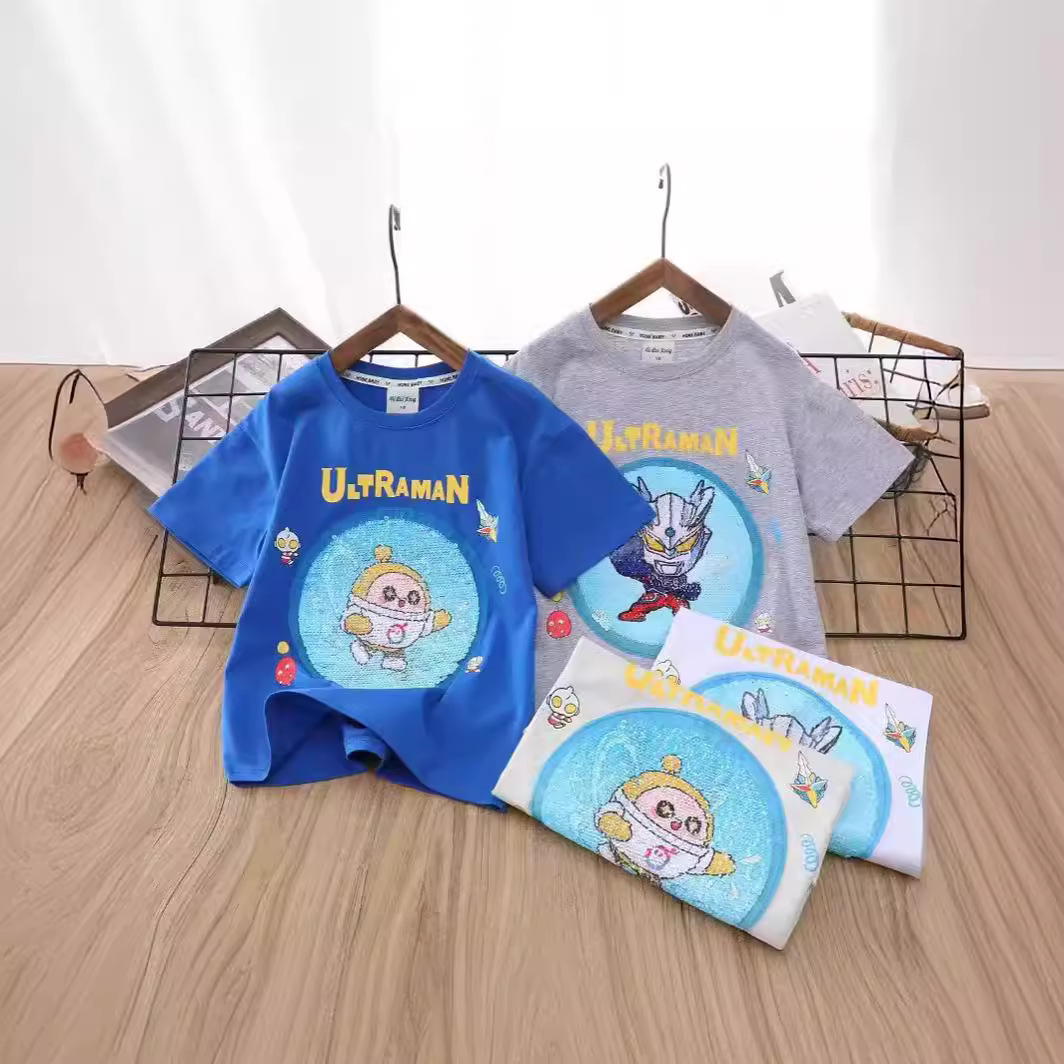 2024 الصيف الأطفال تي شيرت جديد الترتر اللون تغيير الترامان الكرتون جولة الرقبة النمط الغربي قصيرة الأكمام أعلى