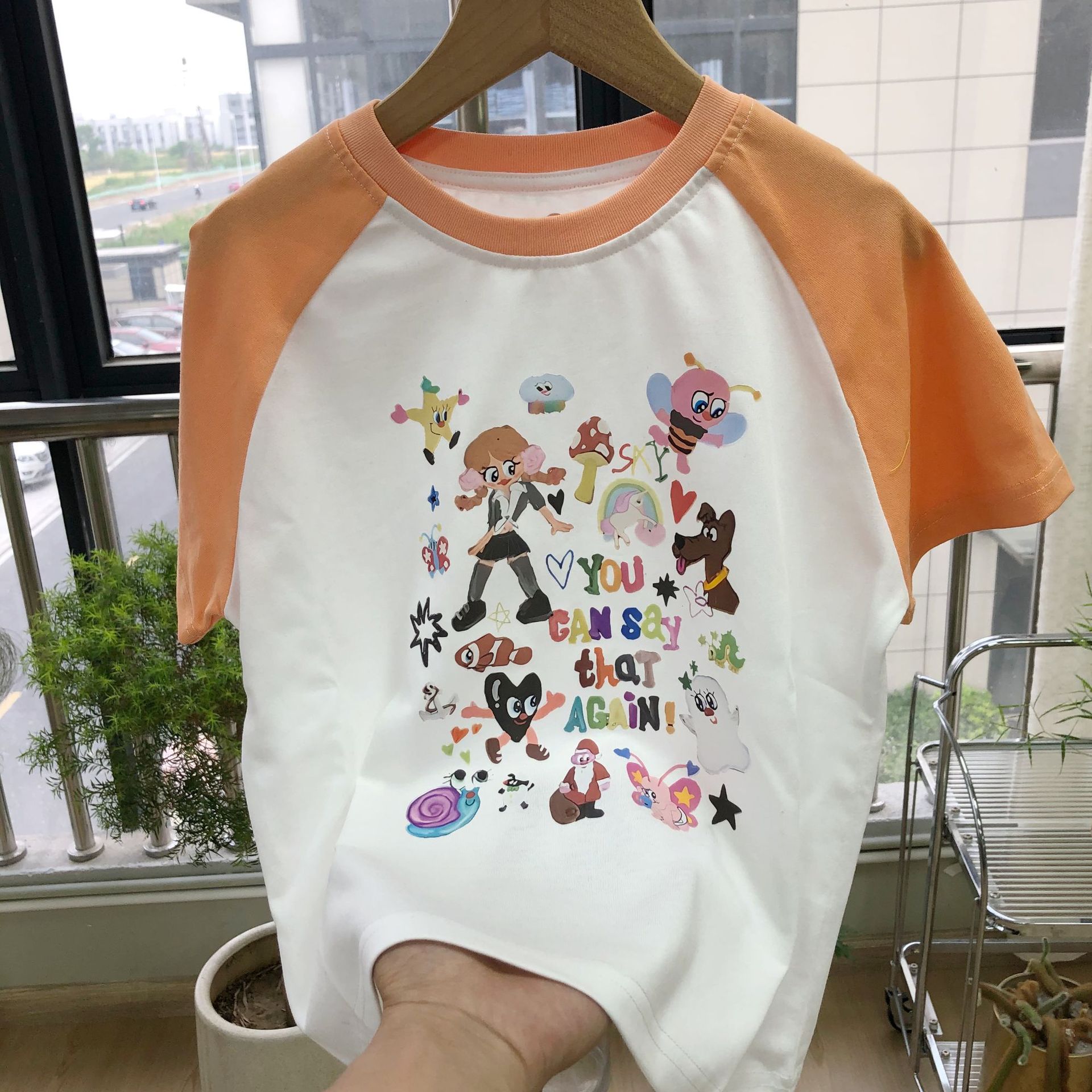 2024 ملابس أطفال صيفية جديدة للأولاد والبنات الكبار من القطن بأكمام راجلان تي شيرت بأكمام قصيرة غير رسمي برسوم كارتونية