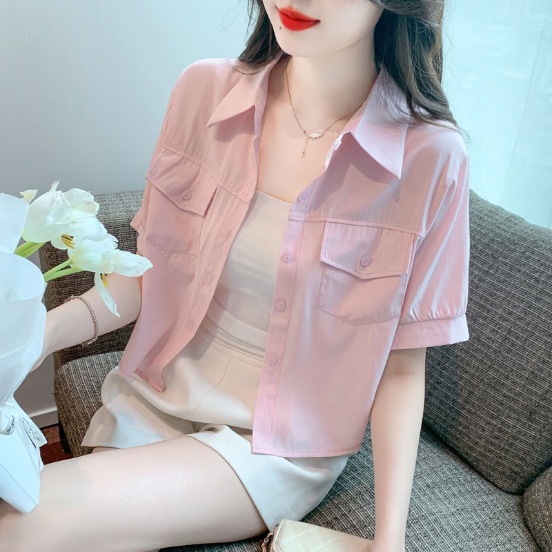 قميص نسائي أبيض بأكمام قصيرة للصيف رقيق 2024 سترة جديدة فضفاضة بياقة بولو قصيرة