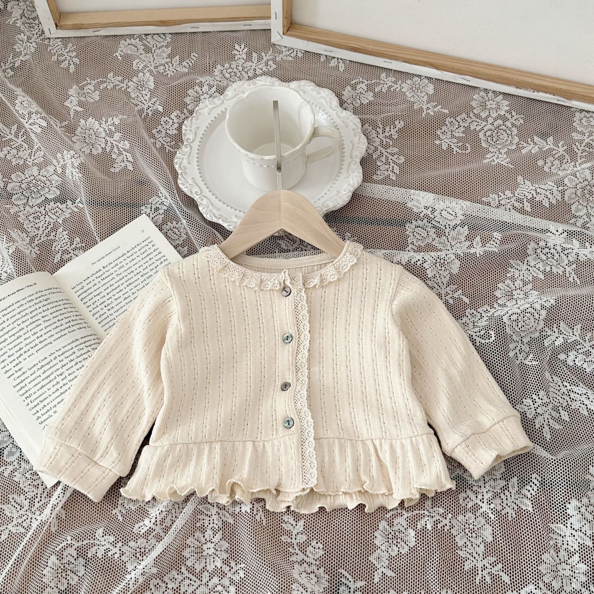 سترة INS للأطفال للربيع والخريف من الدانتيل برقبة دائرية وأكمام طويلة معطف فيبيان بسيط بصدر واحد للفتيات الصغيرات