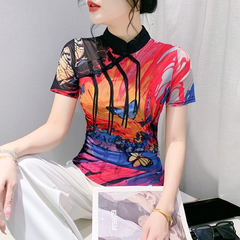 جديد النمط الصيني النمط الصيني زر متابعة طوق قصيرة الأكمام تي شيرت مطبوع المرأة الصيف المألوف سليم صالح التخسيس كل مباراة شبكة أعلى