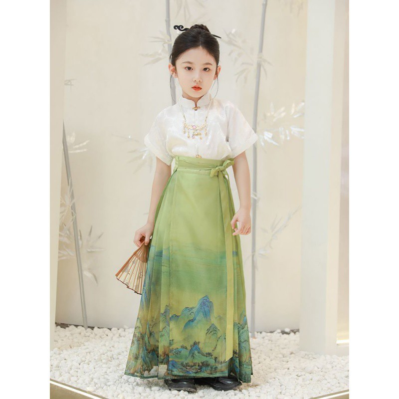 تنورة للفتيات على شكل وجه الحصان بدلة صيفية رفيعة بأكمام قصيرة على الطراز الصيني على شكل ألف ميل جيانغشان تنورة هانفو للأطفال بدلة تانغ على طراز مينغ