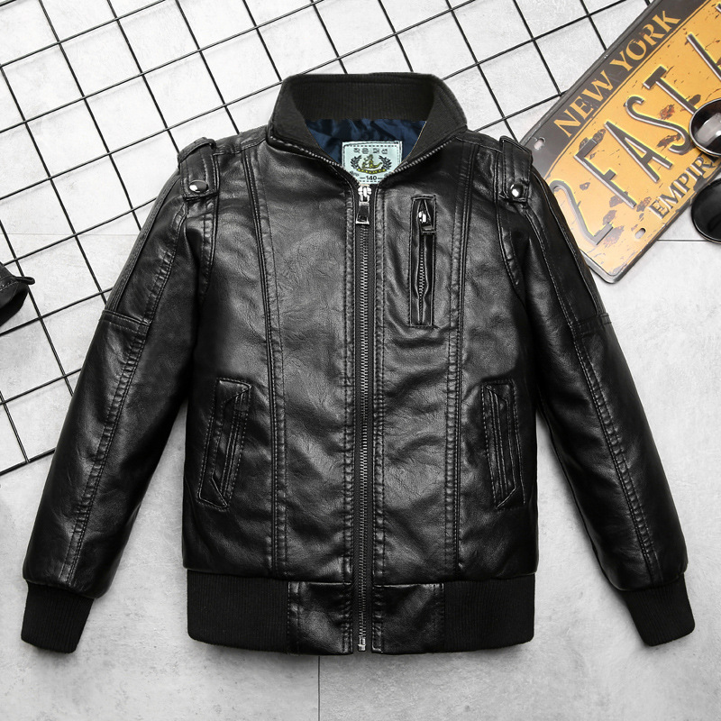 ملابس أطفال سترة أطفال جلدية للأولاد 2024 بياقة ربيع وخريف معطف أطفال كبير ومتوسط وصغير بالإضافة إلى منفذ مصنع مبطن مخملي