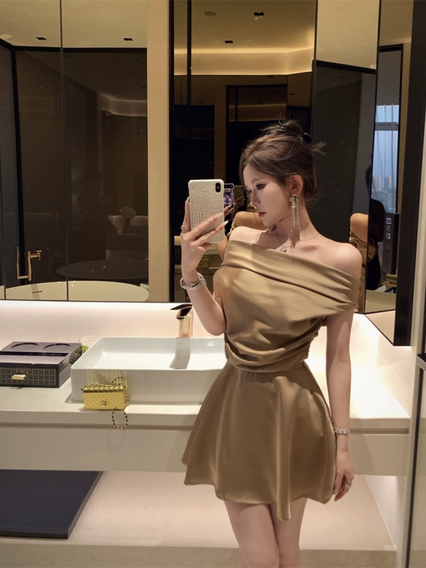 فستان صيفي بأكمام قصيرة وكتف واحد من الساتان
