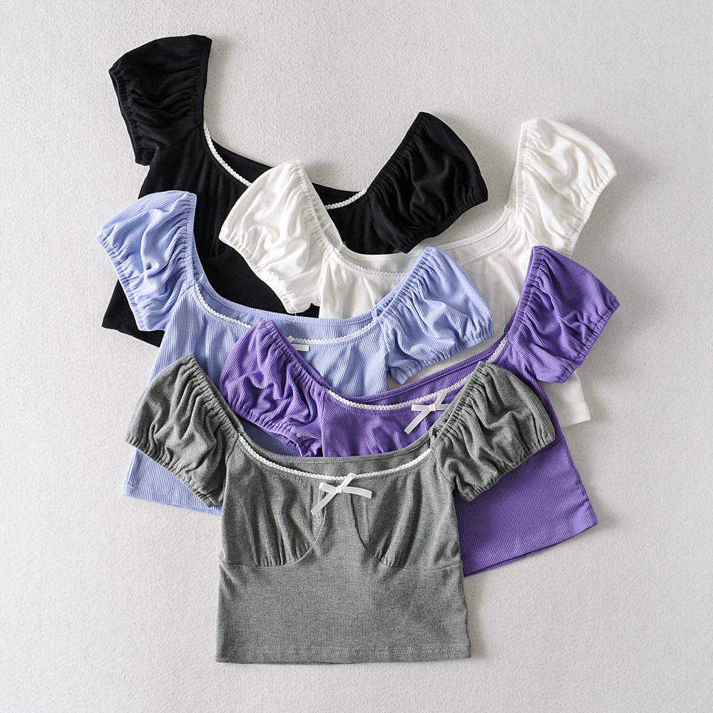 Z2031-21 الكورية نمط سليم صالح ساحة طوق الدانتيل خياطة الصدر القوس الموضوع السرة مفتوحة تي شيرتات قصيرة الاكمام