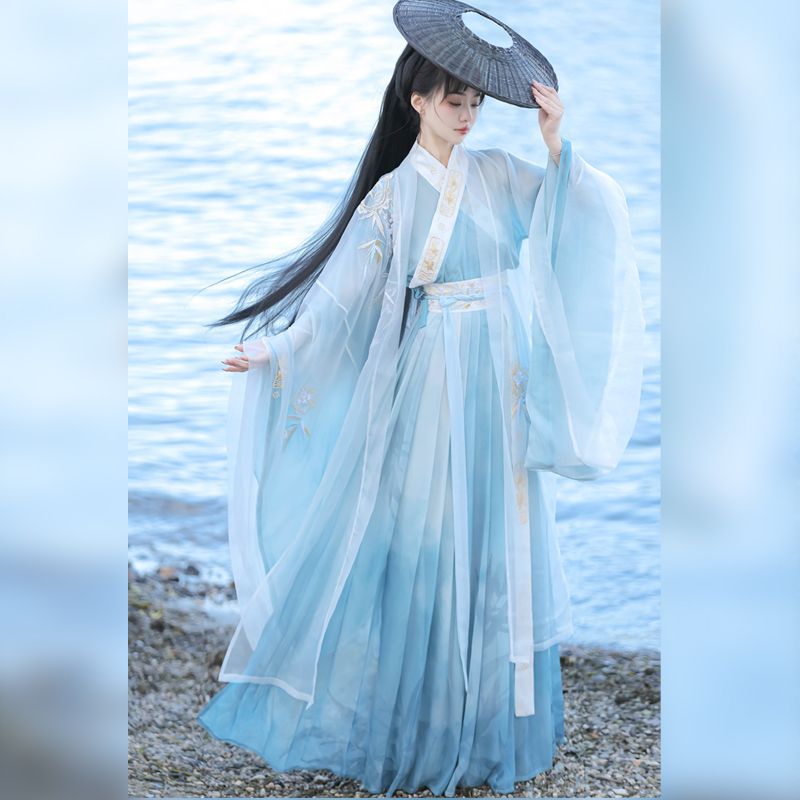 فستان هانفو الأصلي للسيدات 2024 بتصميم جديد وي جين السلالات الجنوبية والشمالية القديمة كوستانس شعور رائع على الطراز الوطني مطرز يدويًا وياقة على الخصر فستان صيفي