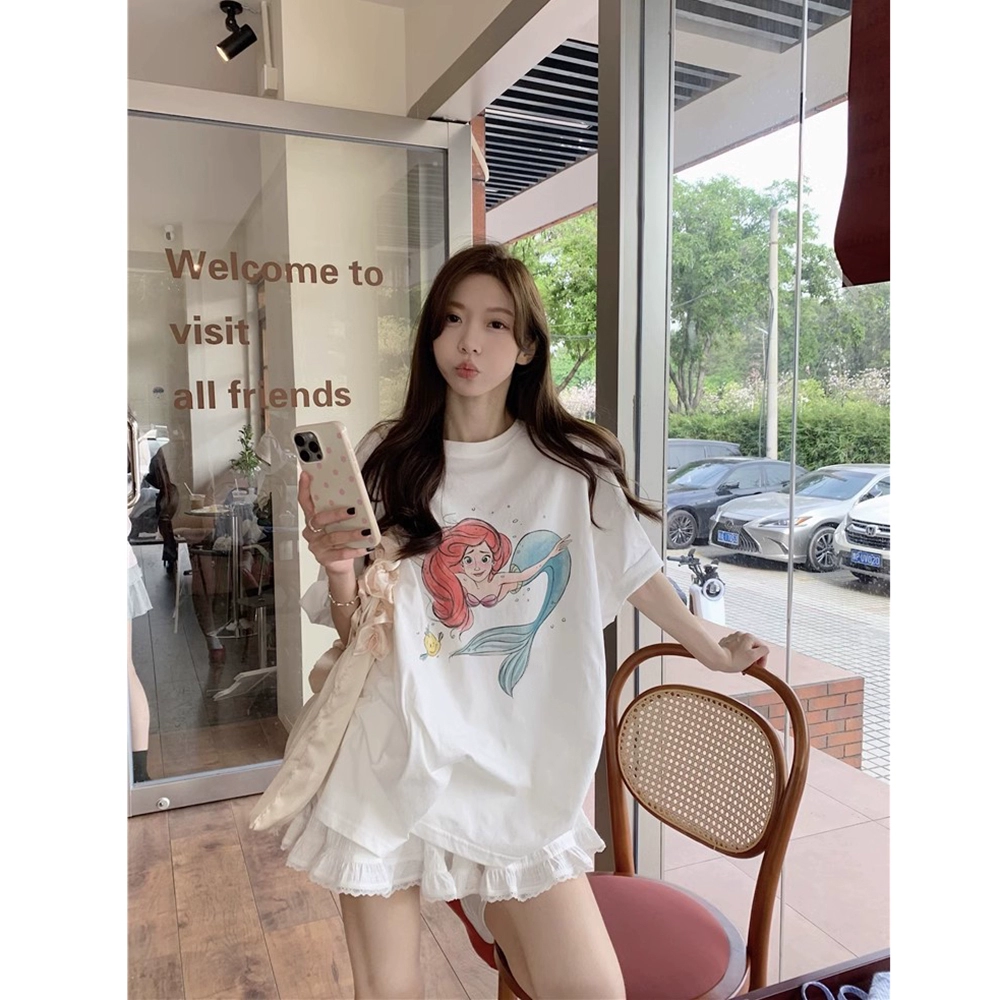 المرأة المطبوعة كم قصير الصيف فضفاضة جولة الرقبة الكرتون