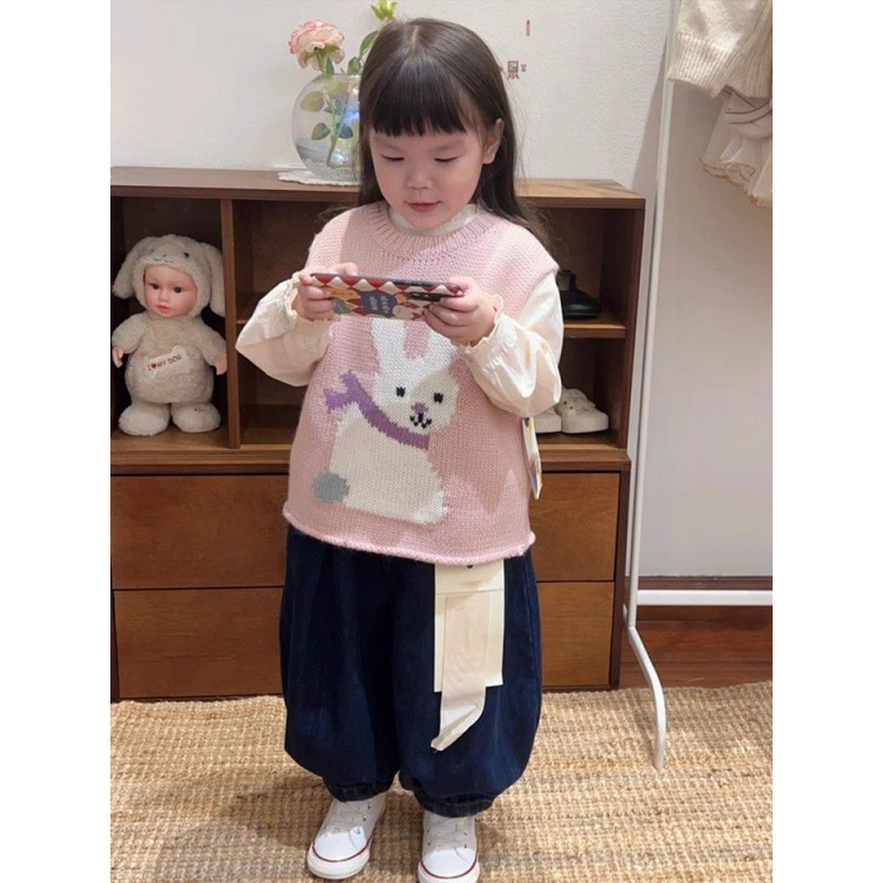 كوريا الجنوبية ملابس الأطفال 2024 الخريف الفتاة الحلو أرنب مطرزة محبوك سترة الفتاة سترة غير رسمية سترة دون أكمام