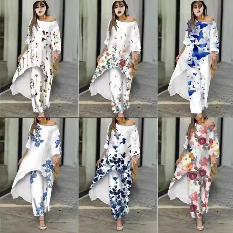 2023 ملابس نسائية أوروبية وأمريكية جديدة موضة غير رسمية فضفاضة غير منتظمة مطبوعة تسعة أرباع كم ملابس وقاية من الشمس سراويل واسعة الساق